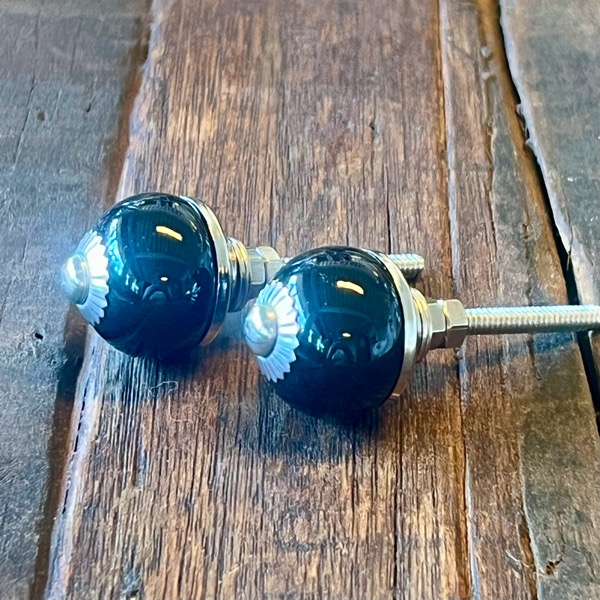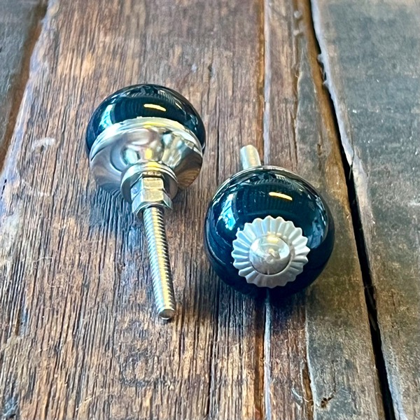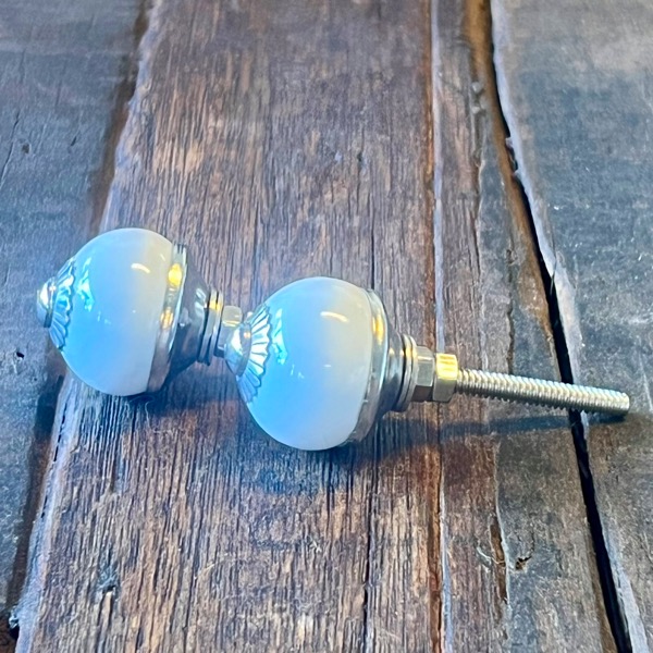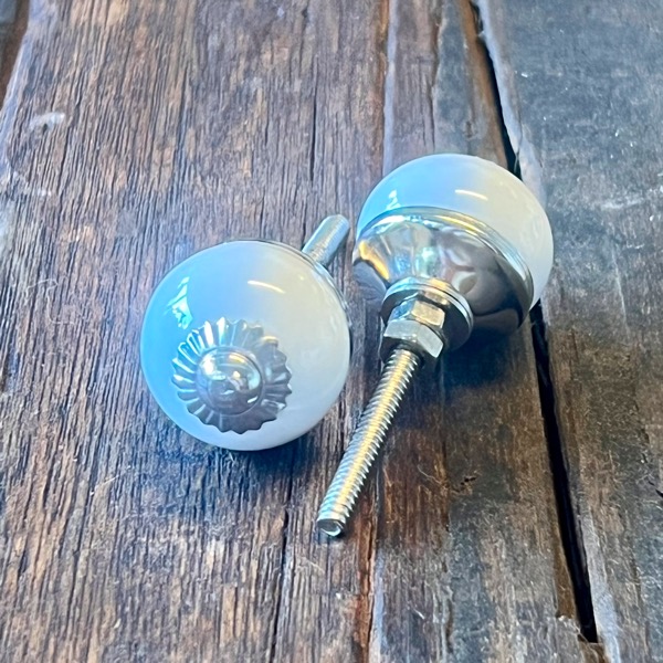 Skruen går gennem porcelænskuglen og de to kapper. Den er sølvfarvet.