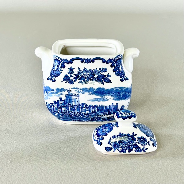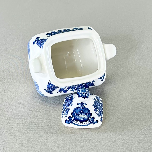 Den kæreste lille firkantede sukkerskål med låg og små ører (håndtag) i engelsk porcelæn.