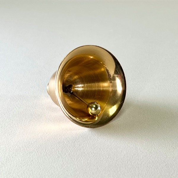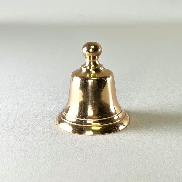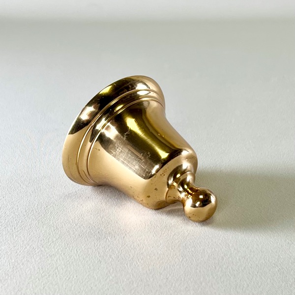 Virkelig smuk messing klokke som både kan stå på bordet som den er - og med lidt snilde kan man nok også binde et bånd eller en lædersnor omkring, så den kan hænge.