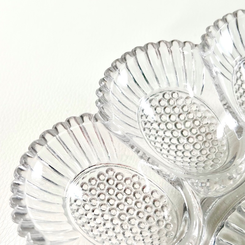 Fantastisk smukt vintage æggefad med plads til 12 æg og lidt tilbehør i midten.