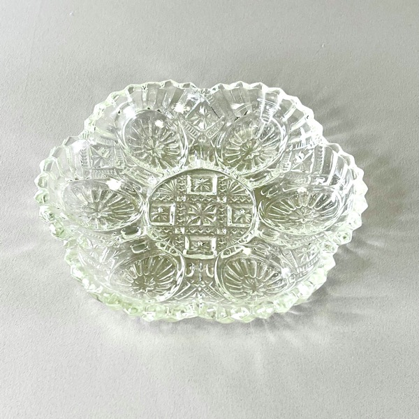 Smukt retro æggefad fra Fyens Glasværk i presset glas med plads til 6 æg og lidt pynt i midten.