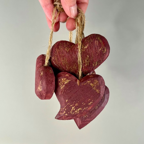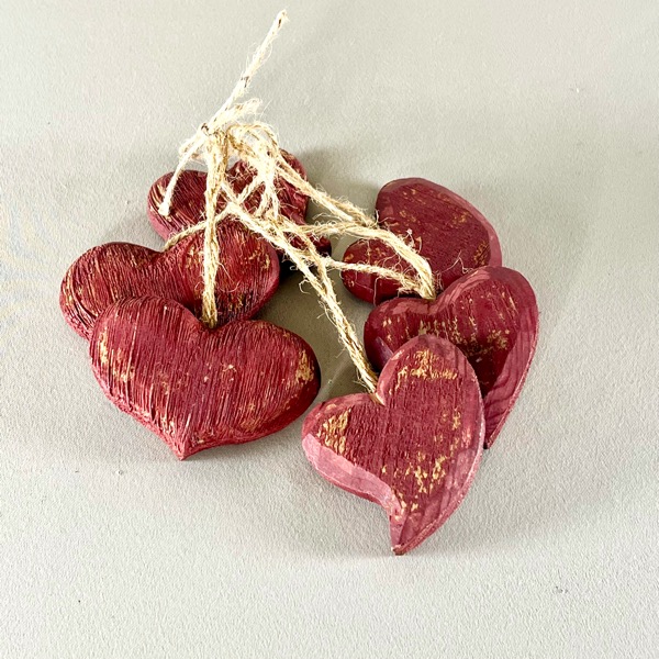 En lille klase med 6 røde træhjerter - lige til at hænge på juletræet eller måske bare en grangren.