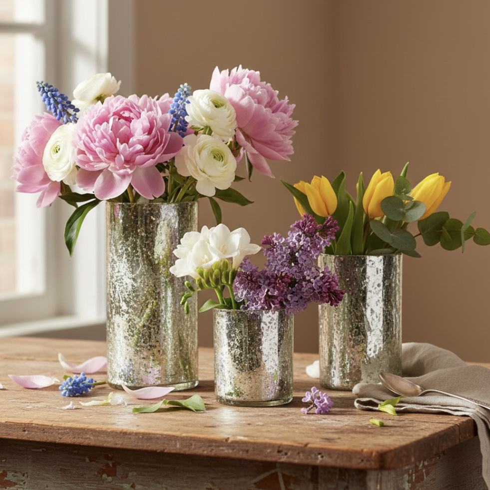 Smukke sølvfarvede vaser med delikat meleret finish.